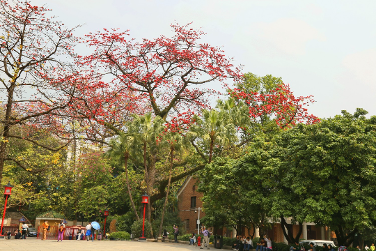 阳春三月,广州市中山纪念堂的百年“木棉王”红花盛放