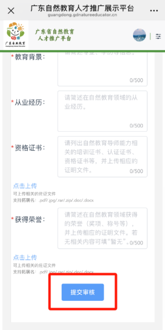 第四步,进入到个人信息页面,点击“修改”,填写所有内容后,点击“提交审核”即可。提交后会进行人工审核,审核通过后将会展示在平台网站。